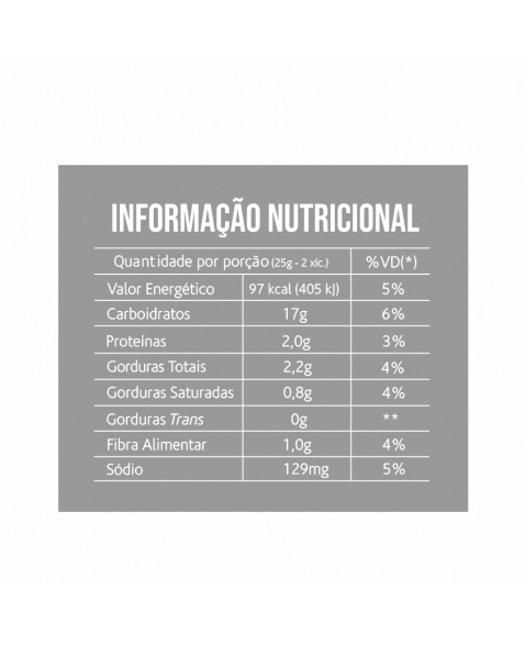 INGREDIENTES: Mix sem glúten (farinha de arroz, farinha integral de sorgo, chia e quinoa), óleo vegetal (palma e soja), condimento preparado sabor churrasco, sal light e cúrcuma.