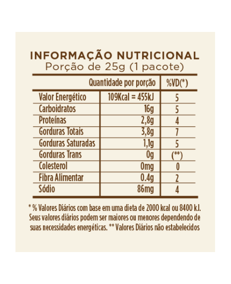 Ingredientes: Farinha de arroz, farinha integral de soja não transgênica, óleo vegetal (palma, soja), ervas finas, sal light, corante natural urucum, aromas.