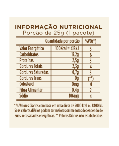 Ingredientes: Farinha de arroz, farinha integral de soja não transgênica, tomate, cenoura, espinafre e salsa desidratados, óleo vegetal (palma, soja), sal light, açúcar, corante natural urucum, aromas.